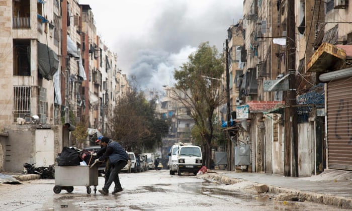 | Civilians take shelter in a rebel-held neighbourhood in Aleppo. Photograph: Karam al-Masri/AFP/Getty Images |