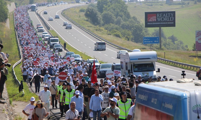 Their route included marching up mountains in pouring rain. One marcher experienced a lethal heart attack on the march. More people joined them as the march progressed, until their numbers swelled to ten thousand and counting coming in afresh. They were expressing their outrage over President Recep Tayyip Erdogan's state of emergency declaration that gave the authorities in Ankara the opportunity to round people up wholesale, accusing them of helping to plot the failed coup of 2016.
