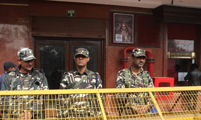 | Indian security personnel stand guard during the screening of Padmaavat at a cinema hall in New Delhi.