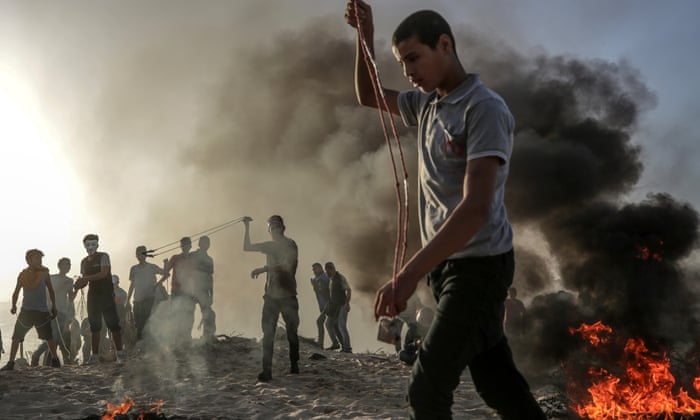 | Palestinian 'protesters' on the border between Israel and the Gaza Strip, October 2018. Photograph: Mohammed Saber/EPA |