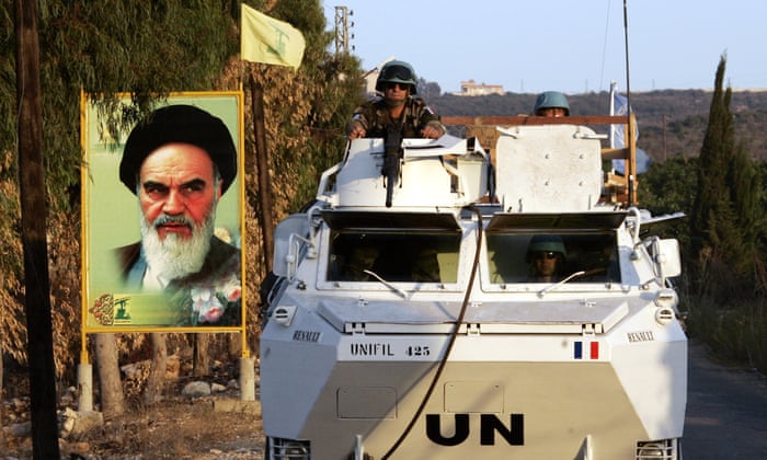 | UN peacekeepers with a billboard showing Iran’s late leader Ayatollah Khomeini after the Israel-Hezbollah war, southern Lebanon, September 2006. Photograph: Francois Mori/AP |