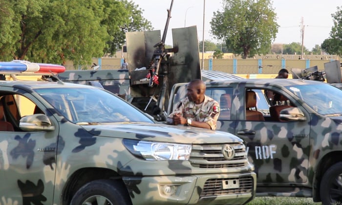 | Soldiers block the entrance of the aid agency Mercy Corps’ office in Maiduguri after closing it down. Photograph: Audu Marte/AFP/Getty Images |