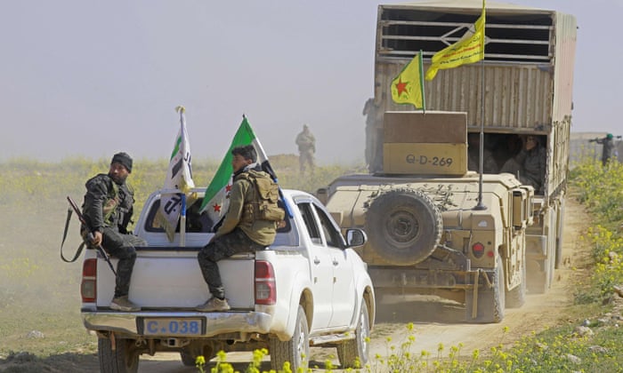| Members of the Kurdish-led Syrian Democratic Forces (SDF) near the Islamic’s State’s last holdout of Baghouz in northern Syria. Photograph: Delil Souleiman/AFP/Getty Images |