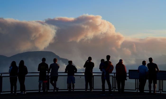 | People view smoke from bushfires in the Blue Mountains, west of Sydney, on Wednesday. NSW is suffering its worst period of air pollution on record, while Qld faces a renewed fire threat and similar smoke pollution. Photograph: Brett Hemmings/Getty Images |