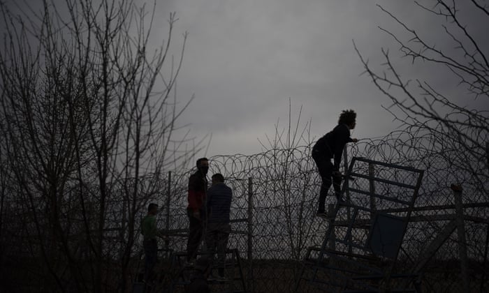 | Migrants and refugees attempt to scale the border fence from Turkey into Greece. Photograph: Felipe Dana/AP |